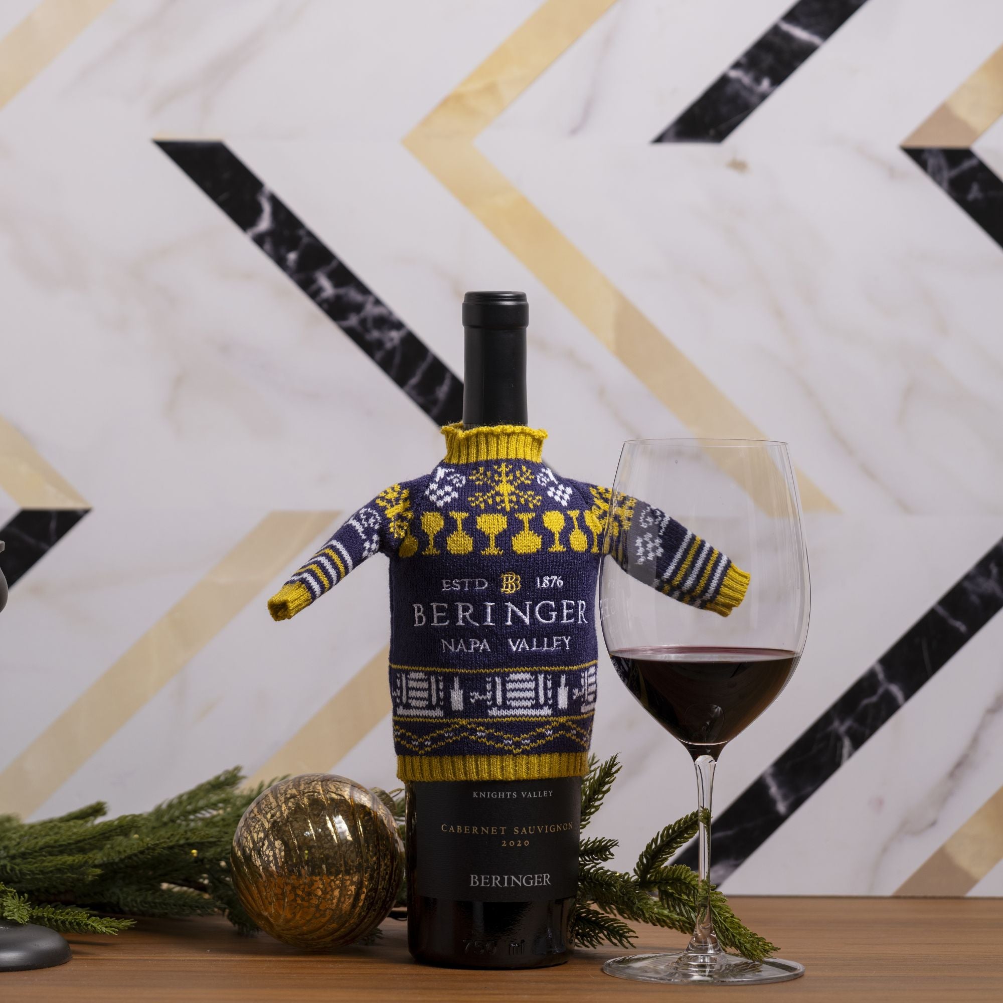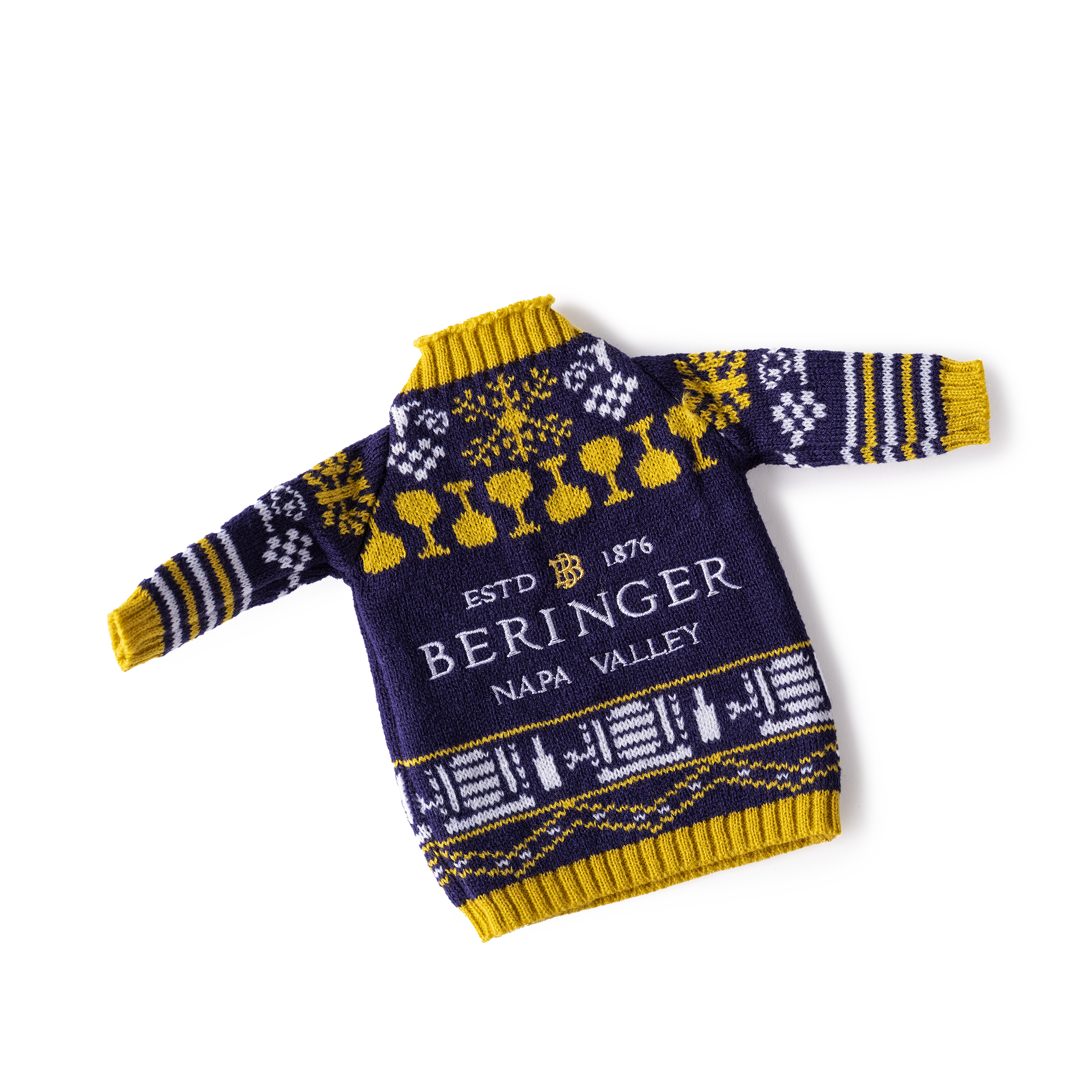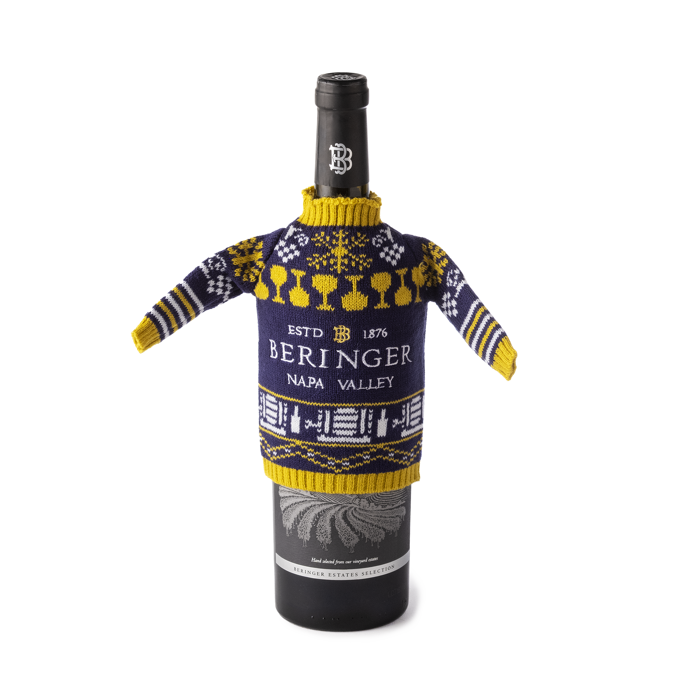 A soft knit bottle sweater designed to fit any wine bottle featuring Beringer branding.